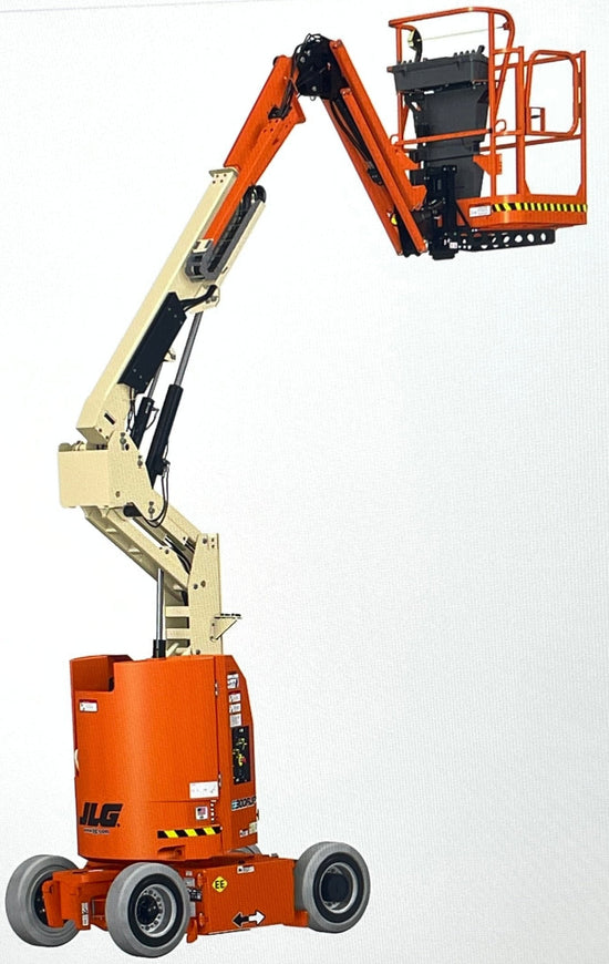 JLG E300AJP 30' 2WD Articulating Boom Lift Man Aerial Platform Accessibility – up and over access, optional jib Maneuverability – move over uneven surfaces with Automatic Traction Control. Productivity – longer with longer duty cycles. Environmentally friendly – zero emissions. Standard LED Motion/Amber Beacon with ClearSky Smart Fleet™ Connectivity Hardware